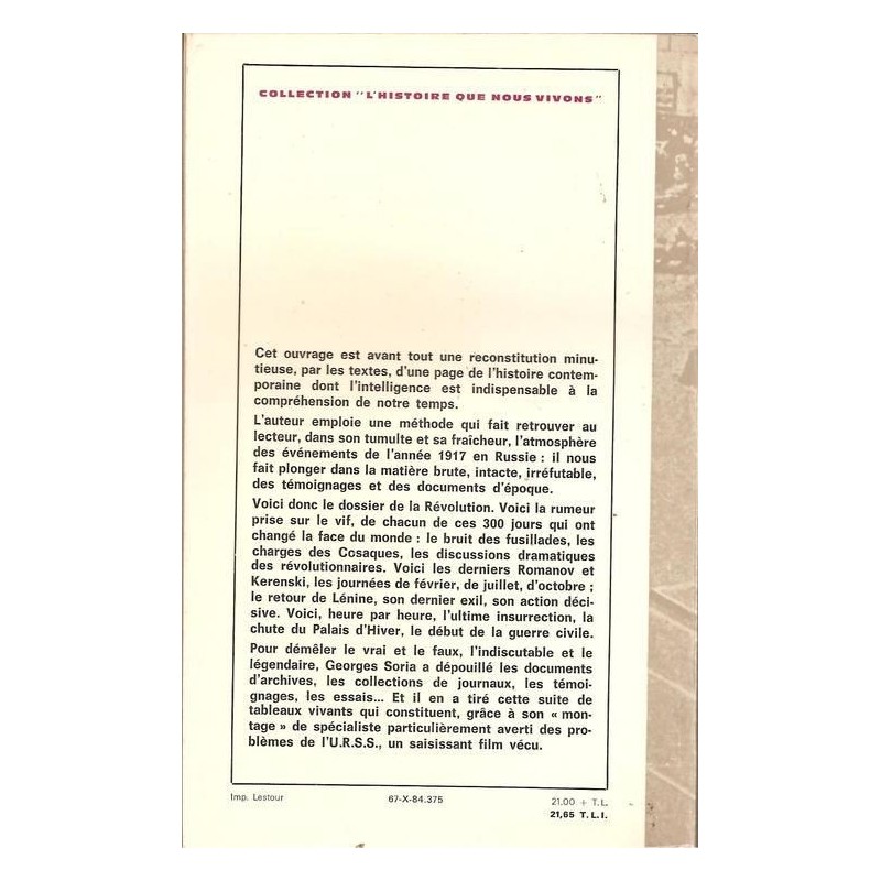 Le livre de Georges Soria, intitulé "Les 300 jours de la révolution russe", se concentre sur la période de la Révolution russe allant de février à octobre 1917. L'auteur explore en détail les événements clés qui ont conduit à la chute du régime tsariste et à l'émergence du premier État socialiste au monde. Soria décrit les conditions sociales et économiques qui ont conduit à la Révolution, y compris la pauvreté, la famine et les inégalités de classe. Il analyse également les tensions politiques au sein du gouvernement russe et les différents groupes révolutionnaires qui cherchaient à renverser le tsar. L'auteur examine en profondeur les événements qui ont marqué la Révolution de février, tels que les grèves, les manifestations et les mutineries militaires, ainsi que la création d'un gouvernement provisoire. Il décrit également la montée du Parti bolchevique dirigé par Lénine et le rôle clé joué par les Soviets (conseils ouvriers) dans le renversement final du gouvernement provisoire en octobre. Soria explore également les implications internationales de la Révolution russe, y compris les réactions des puissances occidentales et les tentatives de la Russie soviétique pour consolider son pouvoir et diffuser la révolution dans d'autres pays. Dans l'ensemble, "Les 300 jours de la révolution russe" est une analyse détaillée et approfondie de l'une des périodes les plus importantes de l'histoire russe et mondiale.