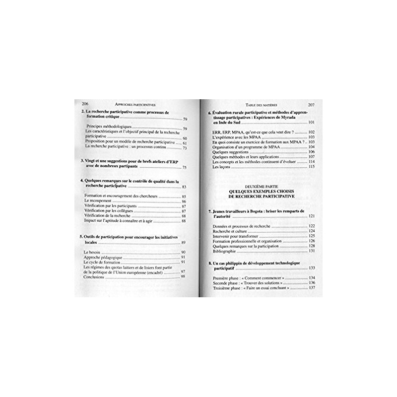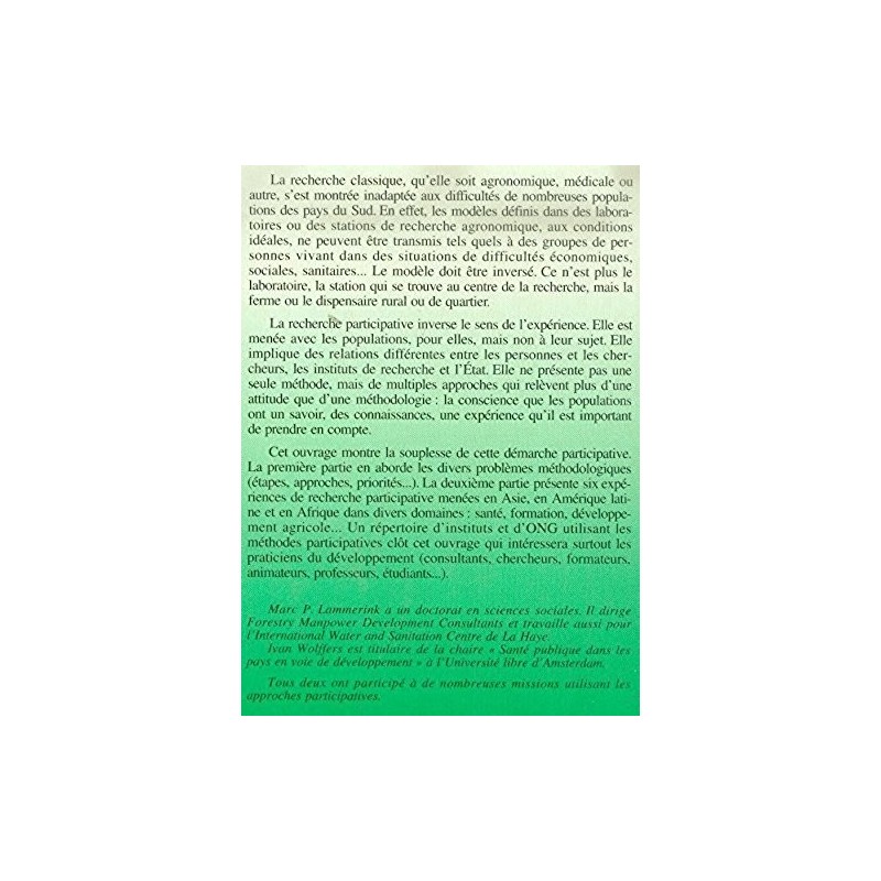 La recherche participative, notamment dans le domaine du développement rural, tient compte, contrairement à la recherche classique, du savoir populaire, de l'expérience concrète des communautés, ainsi que de leurs besoins. Cet ouvrage aborde divers aspects méthologiques de la recherche participative, puis présente 7 cas d'expériences menées dans des pays et des domaines différents.