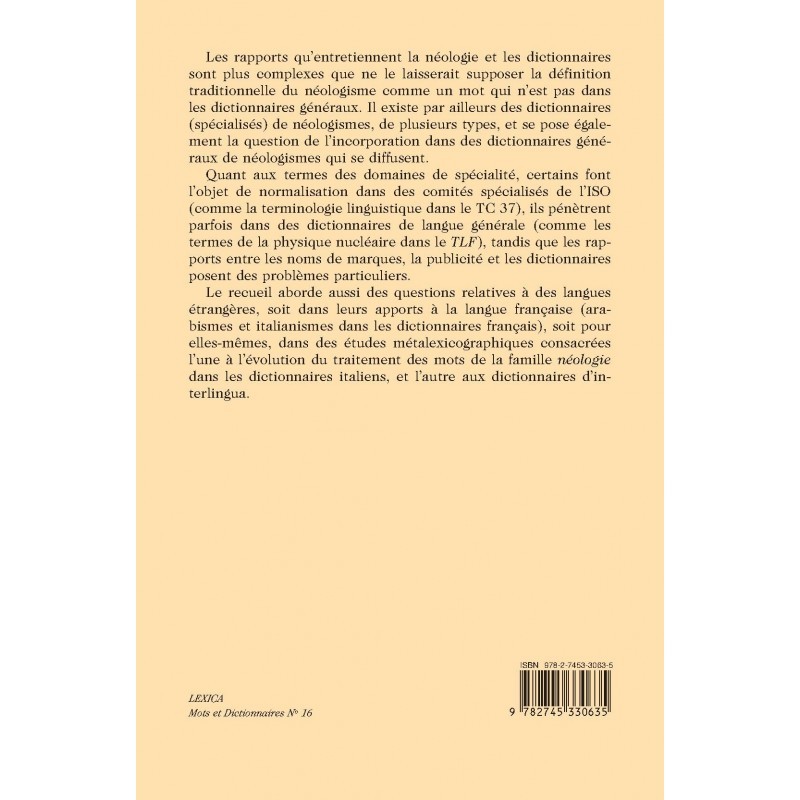 Les rapports qu'entretiennent la néologie et les dictionnaires sont plus complexes que ne le laisserait supposer la définition traditionnelle du néologisme comme un mot qui n'est pas dans les dictionnaires généraux. Il existe par ailleurs des dictionnaires (spécialisés) de néologismes, de plusieurs types, et se pose également la question de l'incorporation dans des dictionnaires généraux de néologismes qui se diffusent. Le recueil aborde aussi des questions relatives à des langues étrangères, soit dans leurs apports à la langue française (arabismes et italianismes dans les dictionnaires français), soit pour elles-mêmes, dans des études métalexicographiques consacrées l'une à l'évolution du traitement des mots de la famille néologie dans les dictionnaires italiens, et l'autre aux dictionnaires d'interlingua.